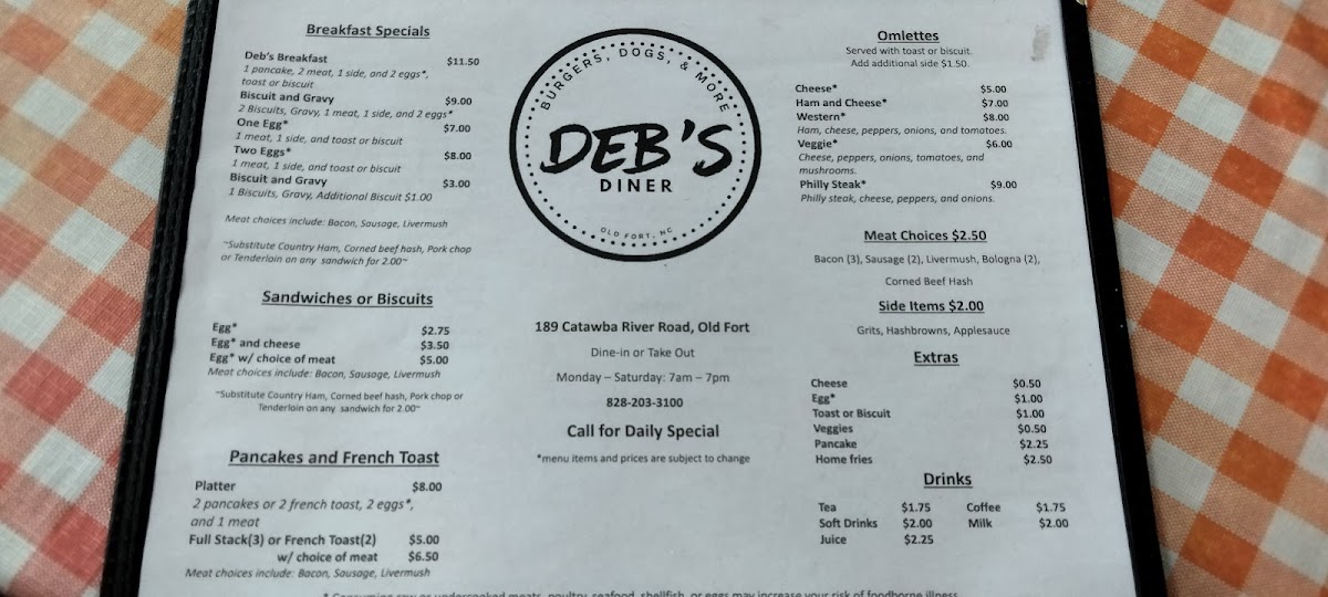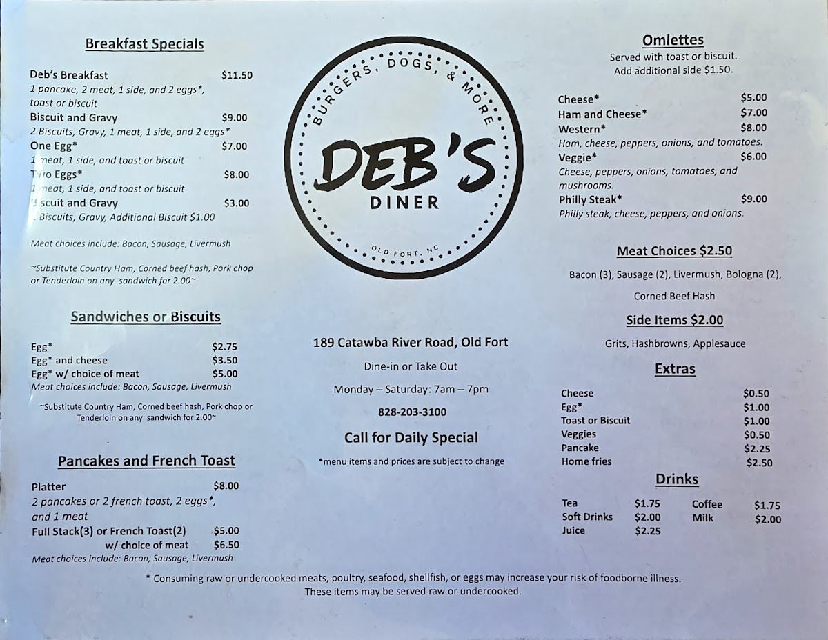 Looking for a cozy spot to enjoy comfort food in Old Fort? Deb's Diner Menu has you covered. Nestled on 189 Catawba River Rd, this charming diner offers a delicious variety of homestyle dishes that will make you feel right at home. Whether you're craving a hearty breakfast to start your day or a satisfying lunch, there’s something for everyone. From sizzling burgers to fresh salads, everything is made with love and served with a smile.